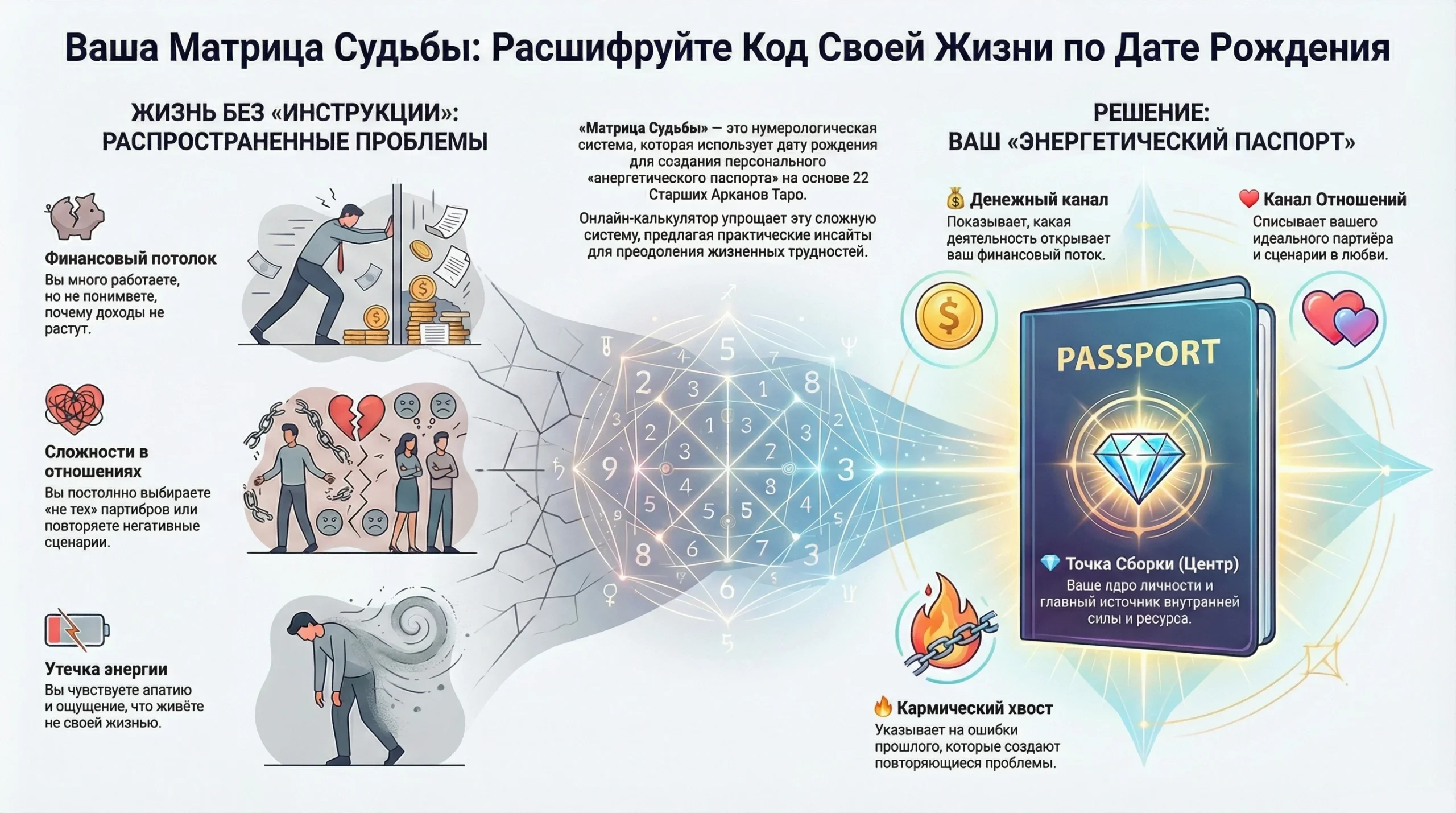 Мы не предлагаем вам абстрактную магию. Матрица Судьбы — это математически точная система, объединяющая архетипы Таро и нумерологию. Наш алгоритм мгновенно строит ваш «энергетический паспорт». Прямо сейчас, на пороге 2026 года, это особенно важно: понимание своих базовых настроек поможет не просто плыть по течению, а оседлать волну грядущих перемен.