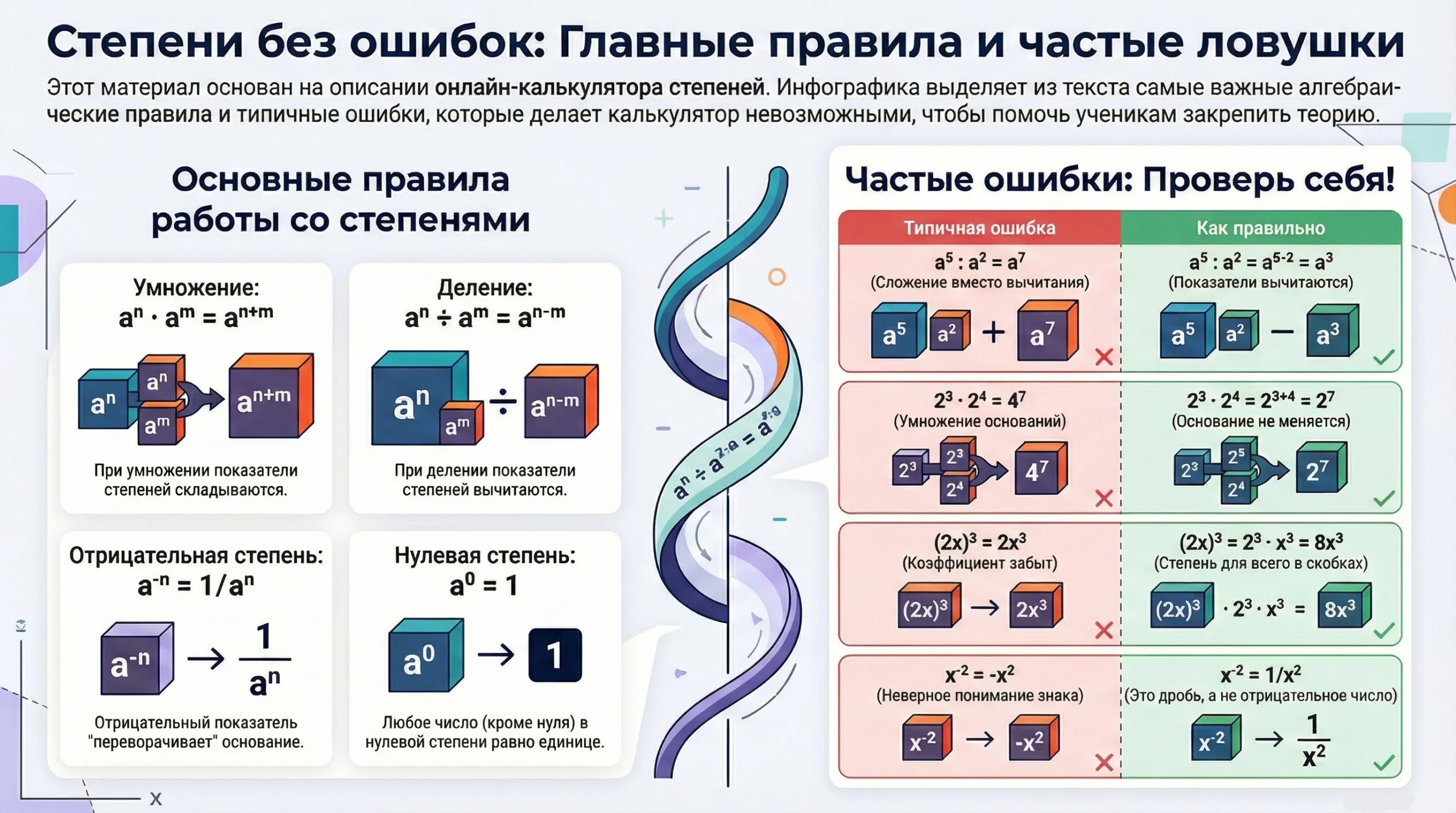 | Сложение при делении | Путают правила. Пишут a⁵ : a² = a⁷. | При делении показатели вычитаются: a⁵⁻² = a³. |