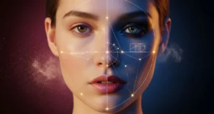 Лицо модели с дневным и вечерним макияжем, схема золотого сечения. Иллюстрация к калькулятору макияжа.